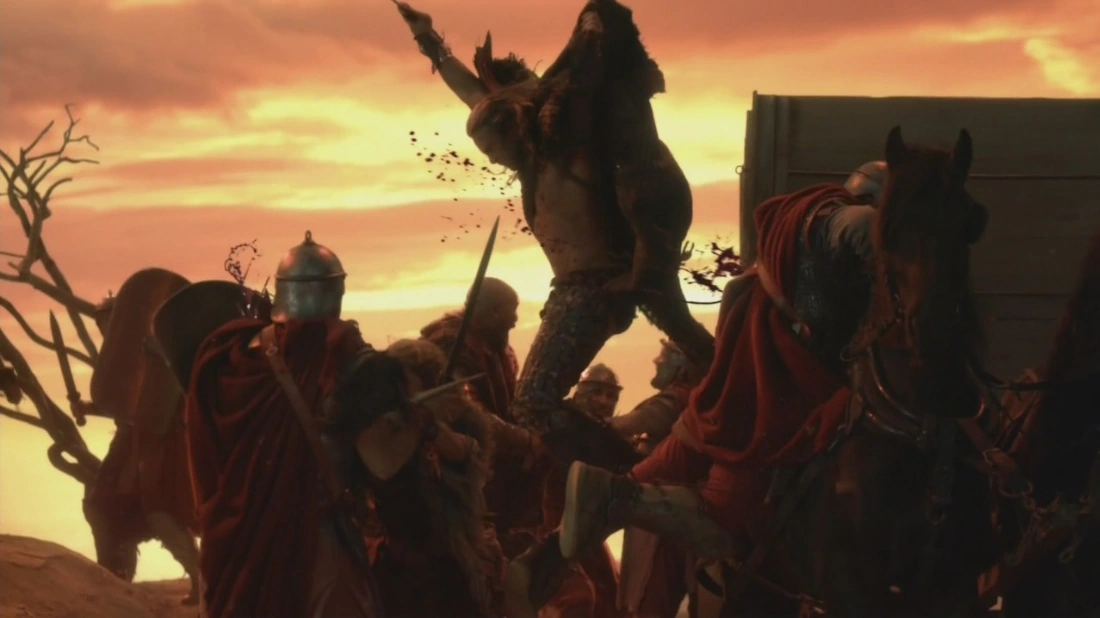 Gannicus does not say anything until Saxa comes up and says they are near land and the blood of Romans. She kisses Gannicus and walks off. Spartacus says that perhaps one day Gannicus will find reason in his heart to "assume deserved mantle". Gannicus makes a joking remark about he may fall this very night and leave Spartacus to cry with the other women he laughs and walks off to join Saxa. A cart being led by Romans is marching towards their destination when the Rebels attack. A brief battle ensues, ending with the rebels killing all the Romans, open the cart and say Crassus well supplies them.