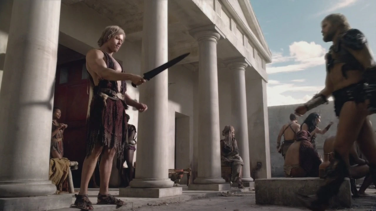 Kore remarks about this as well and suggests that Crassus should try and bring his son closer. Crassus says he would want nothing more but states that his son must find his own path or be forever lost. He and Kore trade a few words before making love. Back in the Sinuessa tavern, Castus is passed out from drink while Nemetes and Caesar question a drunken Heracleo who mistakenly gives out most of Spartacus' plans. While he goes to relieve himself with a prostitute, Nemetes suggests getting more information before going to Crixus. Caesar tells him he was thinking the same.