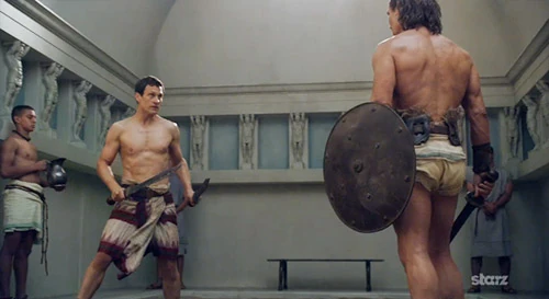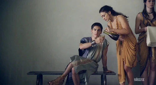 In the slaves' encampment, Gannicus along with his new friends Sanus and Totus trade war stories over wine. Gannicus' lover, Saxa, and two other woman enter and ask for wine leading Gannicus to order his friends out of their own tent to have sex with all three of the women.