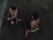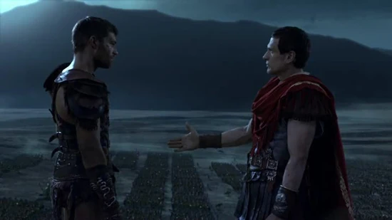 Crassus is carried up to a ridge by his men, but angrily demands to return to the fight, contrary to the insistence of Rufus by his side not to risk his life. Spartacus, in a rage, promptly charges up the ridge and kills Crassus' bodyguards, including Rufus. Now alone, Crassus picks up two swords, to combat Spartacus on equal footing. The two then proceed to engage in an equally-matched fight, though out of the two, Spartacus is considerably more weathered and exhausted from the final battle between Crassus’ legions and the last of the Rebel King’s forces. Spartacus manages to disarm Crassus, but Crassus pulls a familiar trick he did against Hilarus; yanking the naked sword from Spartacus with his bare hands, and shoving the blade at Spartacus' torso. Spartacus, however, stops the blade using the exact same trick, headbutts Crassus, and body slams him into the dirt.