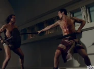 When Crixus' army defeats Arrius and his legions outside of Rome, Crassus' legions appear on the horizon, taking Crixus and his rebels by surprise. Charging forth, Crassus' men completely annihilate the rebels serving under Crixus. While attempting to fight his way toward Crassus, Crixus is attacked by Caesar who he defeats in battle but is speared through the back by Tiberius. Crassus appears and after pondering on what to do with the mortally wounded rebel general, Crassus' orders for Tiberius to reclaim his sword and use it to behead Crixus and that his head be sent back to Spartacus as a message of his failed future fate.