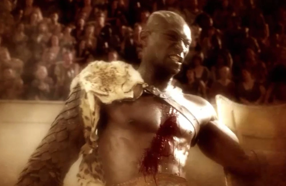 When the face the giant in arena, Crixus' arrogance leads him to be bested and wounded in nearly the same way as Doctore was, and it is only by the efforts of Spartacus, and Crixus' last feeble stand that the giant is killed, although Crixus nearly dies from his wounds.