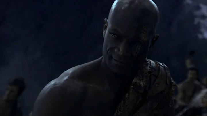 Oenomaus soon leads the rebels into battle after seeing the signal (Roman camps being destroyed). He once again finds himself doing battle together with his fellow brothers against the Roman soldiers. Oenomaus easily kills several soldiers. Gannicus, spotting the Egyptian engages him with haste. Although displaying a valiant effort he is quickly overpowered and knocked to the ground. As the Egyptian motions to deal a crippling blow, Oenomaus intervenes saving Gannicus' life.