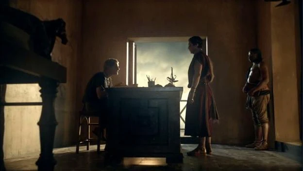 Inside the villa, Quintus, Lucretia and Gaia are celebrating with more wine and sex when his' father, Titus, arrives unexpectedly and stumbles in on the three's activities. Calling Quintus to him, he admonishes his son for the state he has allowed the ludus to fall into. He reveals his knowledge of the' clashes with Tullius from Solonius, and says it is the reason for his swift return. Titus goes about setting things right. When Quintus describes his securing of Gannicus in the primus, his father laughs at him stating that Gannicus is a joke who inspires more laughter than awe.