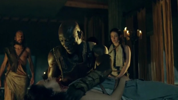 When Gannicus brings Melitta's body up to the villa, Lucretia pales at the sight of it, knowing of her own mistake. Snatching the wine jug away from Gannicus, Lucretia tells Gannicus to tell no one that Melitta was with him when she died, and tells him to leave.