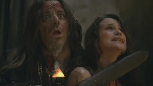 Heracleo pressing a sword to Sibyl's throat.
