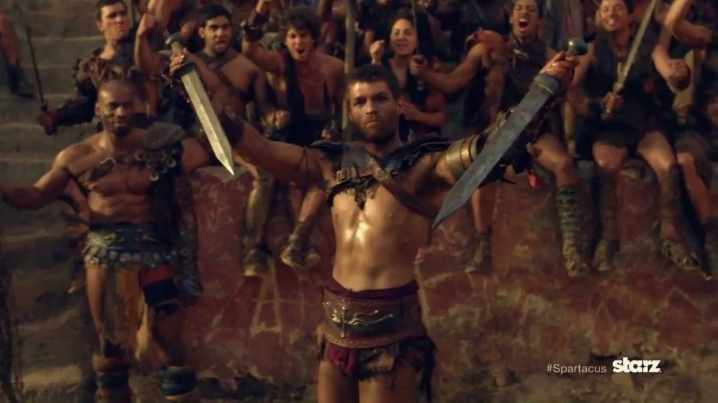 ground in an X shape. He then fights them unarmed, but proves very proficient with the use of his fists, and is able to dodge, hit, and grapple very effectively. Spartacus takes the combatant wearing chainmail by the head, and slams him between the buried swords, slitting his throat and killing him swiftly. Spartacus quickly disarms the remaining Roman, who then attempts to strike him using his own fists, which proves incredibly futile. Spartacus reclaims his swords, stands behind the injured and exhausted Roman, and kicks him. He then jumps up into the air and drives the swords through his eyes, killing him and drawing forth a huge roar from the rebels. Gannicus is called out by Spartacus, who claims that two Romans is not enough. He orders three to fight him. During the fight, as Spartacus returns to his seat next to Laeta, she says that Gannicus seeks to best him. He replies with, "Gladiators seek to best all, it is how they survive." Gannicus is seemingly outmatched when t