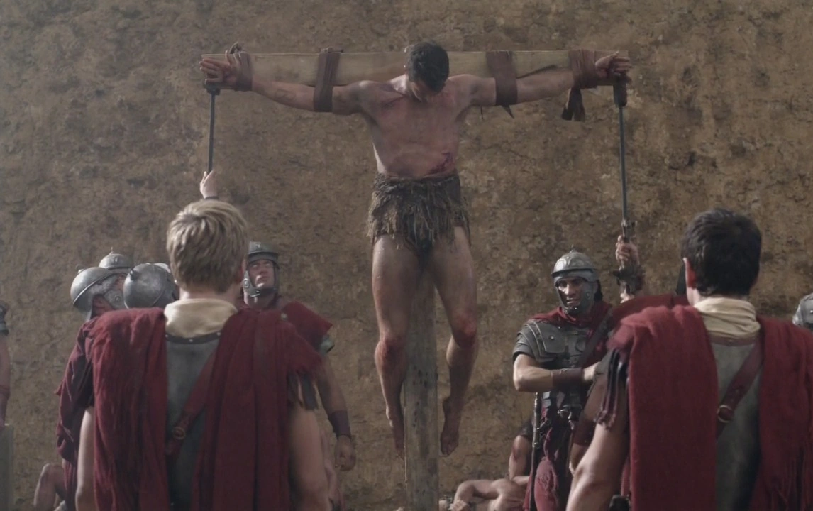 In the Roman camp, there are still survivors from Crixus' last battle, now prisoners; including Agron who survived his wound inflicted by Tiberius. Agron is beaten for not giving information about the location of the rebel army. When Caesar aproaches, the German tries to get up but is punched by a Roman and Caesar tells Crassus that he was a rebel high standing with Spartacus while Crixus and Gannicus were equals in strength. Crassus commands him to be nailed to a cross as a warning, with Caesar helping in the act. When Crassus learns of his son's capture by a messenger, he sends Caesar to offer a trade: the 500 survivors for Tiberius' life.