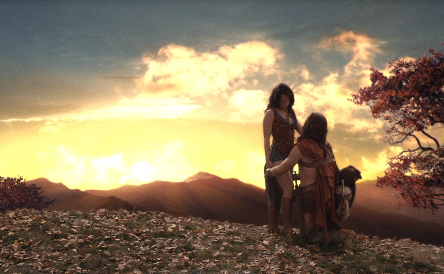 Back near a village, Sura is picking fruit when a group of barbarians close in on her. She manages to fight one off her with a rock to the head and defend herself with his sword before the remainder closes in on her. Her husband comes to the rescue, and together they fight off the rest of them. After a moment's reunion, the two see their village in the distance, the buildings burning and screams resounding from it. They decide to flee into the wilderness.