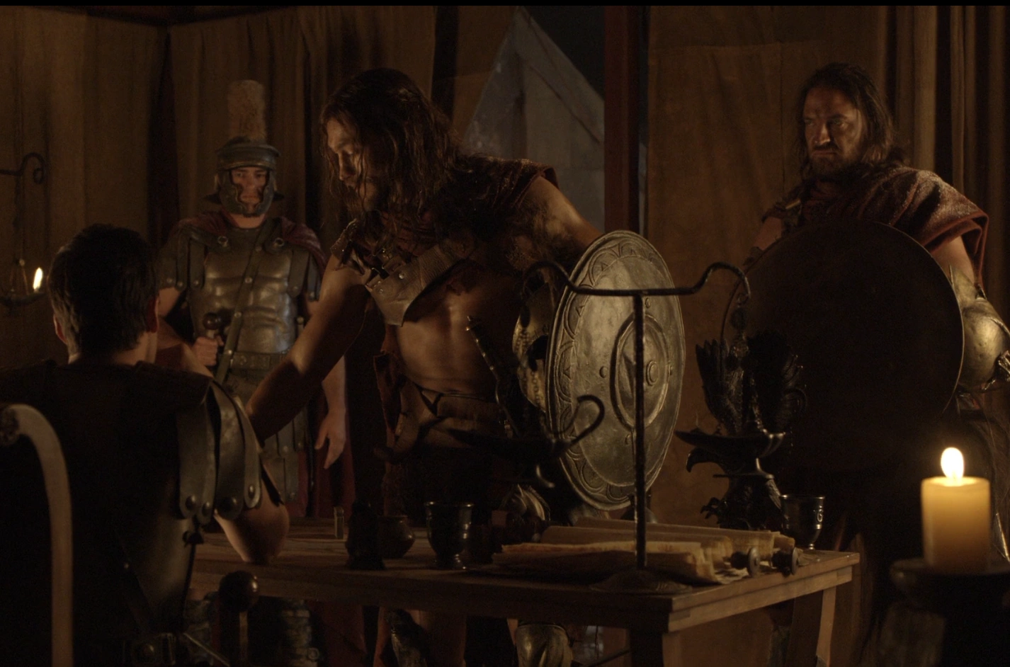 Glaber returns to his tent to find his wife, Ilithyia, waiting for him. She sneaked into the camp, without her father's permission, to bring her husband a gift of wine and companionship in bed. She mentions that her father, Senator Albinius, will be displeased if Glaber returns unfruitful in battle.