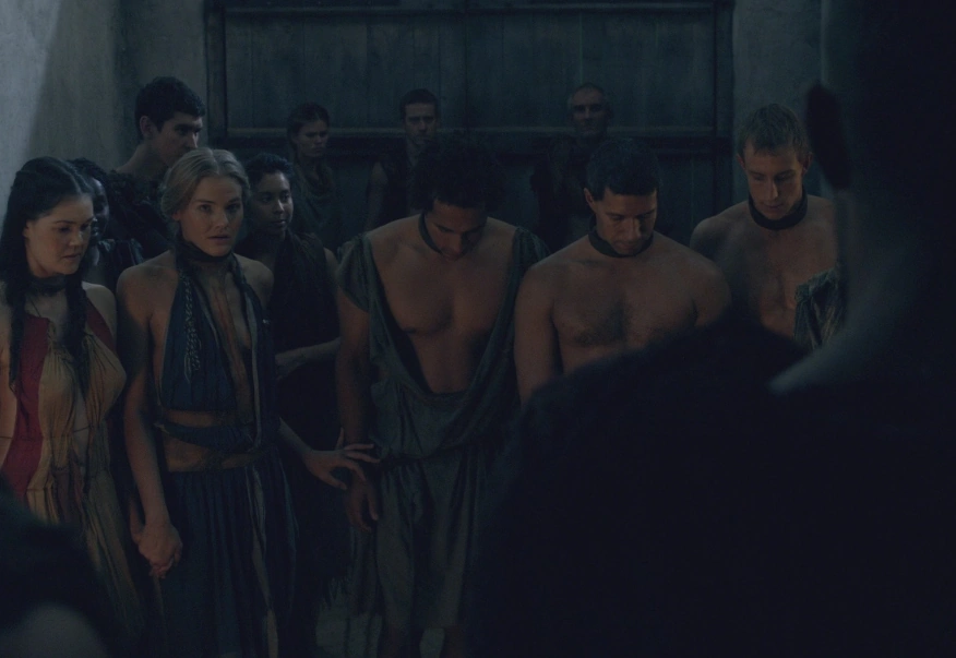 The blonde slave, second from the left, can be seen in Chosen Path, joyfully listening to Donar as he recounts the burning of the Arena in Capua.