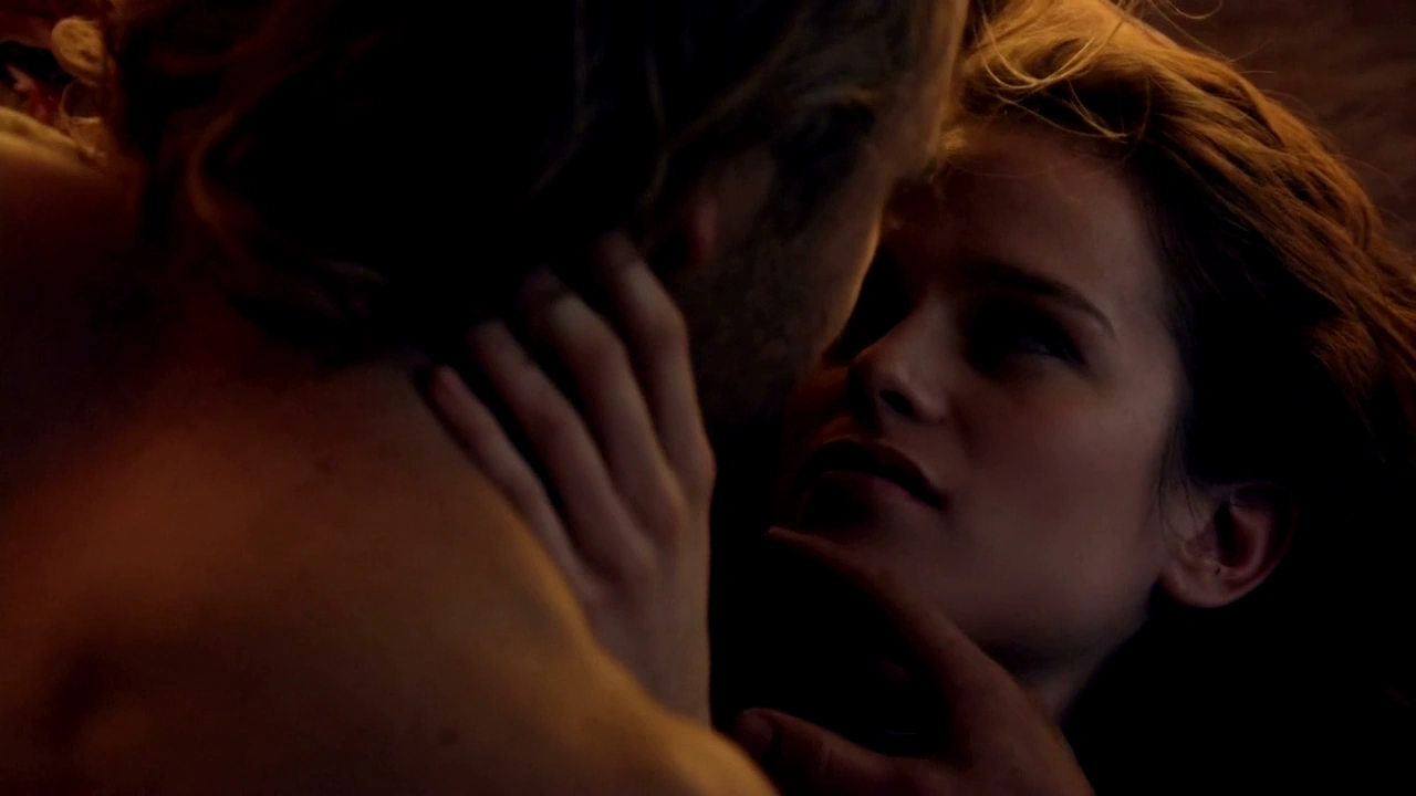 Crassus prepares to meet Spartacus by sparring with his men. He proves himself a very proficient dual-swordsmanship specialist. Kore is brought to him in shackles and the two go into his tent. She looks at the