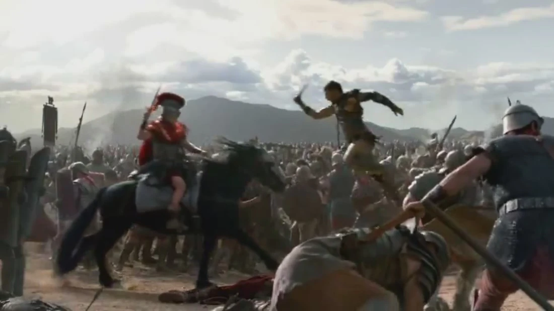 well. He says it will end the war, and fratricide in this instance is acceptable. Spartacus tells his people to press forward ahead of the fire. Lugo is set on fire by a catapult and consumed but not before he kills several Romans. Caesar is appalled at Crassus' indifference to the fates of his men. Crassus forcefully reiterates that it's a necessary evil and believes the battle will end soon, when large numbers of Rebel cavalry lead by Gannicus and Saxa sweep up, ambushing the Roman troops manning the siege engines. Gannicus orders Saxa and Correus to dismount and turn the siege weapons against the rear of the Roman lines and for Pleuratos to hold the left flank. This explains the comparatively minuscule size of Spartacus' original forces. Seeing the flank being overpowered, Crassus sends Caesar to lead the rear's defence. The fighting becomes confusing and intense with many falling