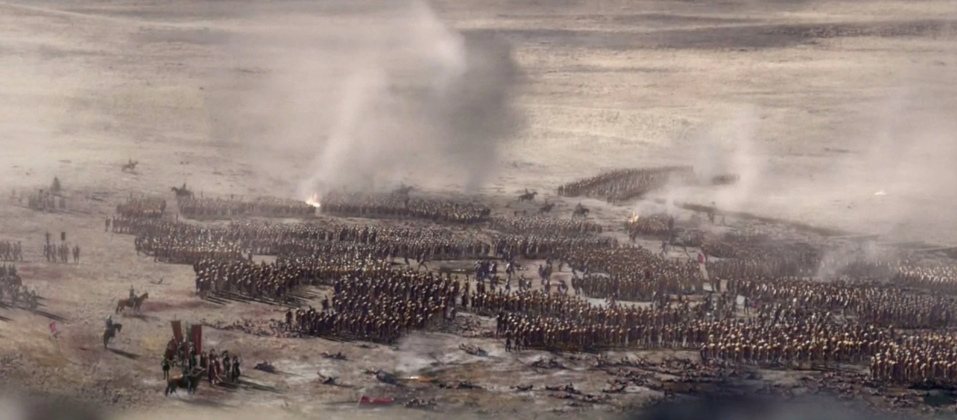 Crassus tells his men to show no mercy. The Romans then use siege engines to rain pitch pots and ballista bolts on the rebel army, to which Spartacus orders the rebel army to advance, so that the siege weaponry cannot fire without the risk of hitting Roman lines. The Roman infantry advance in tandem.